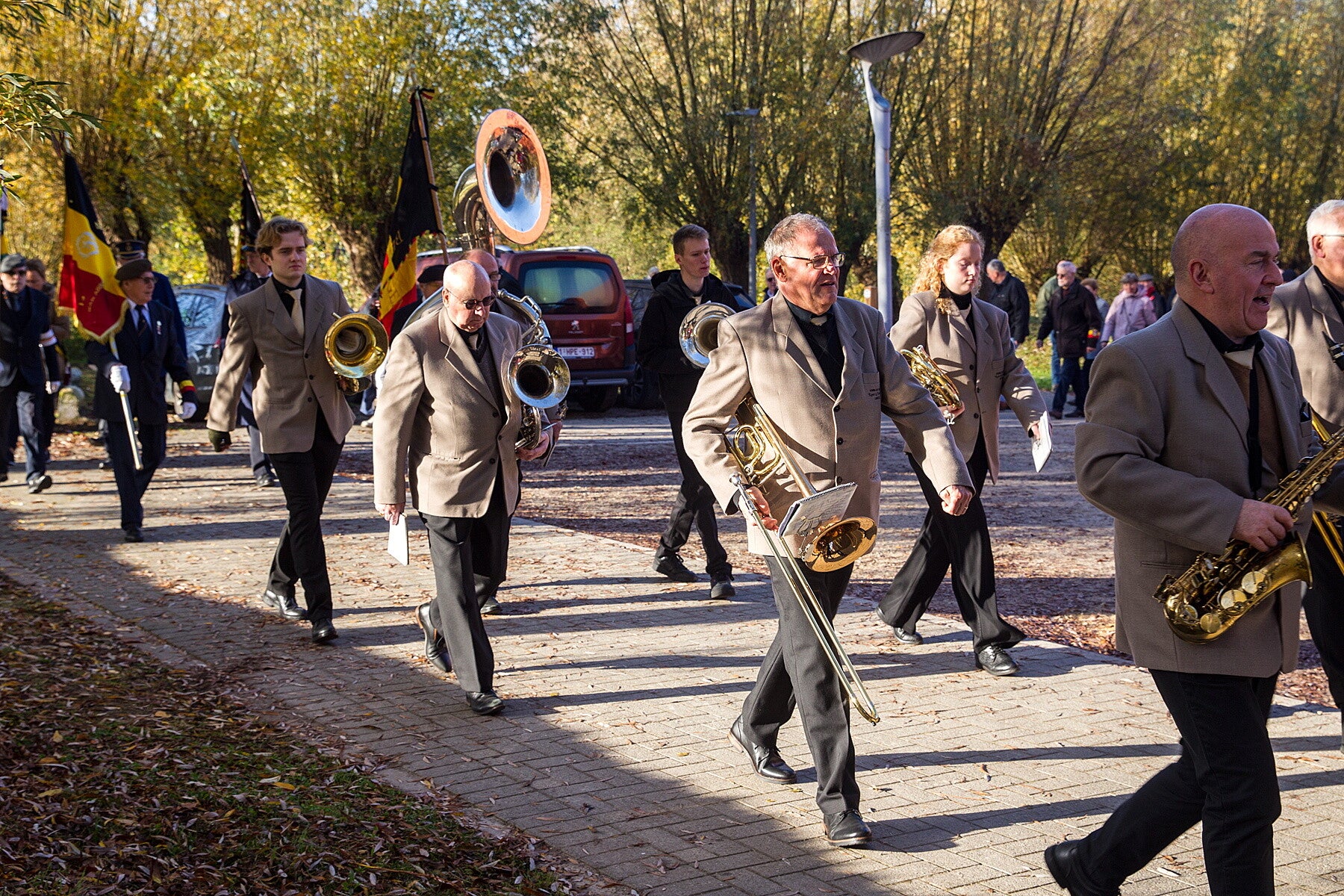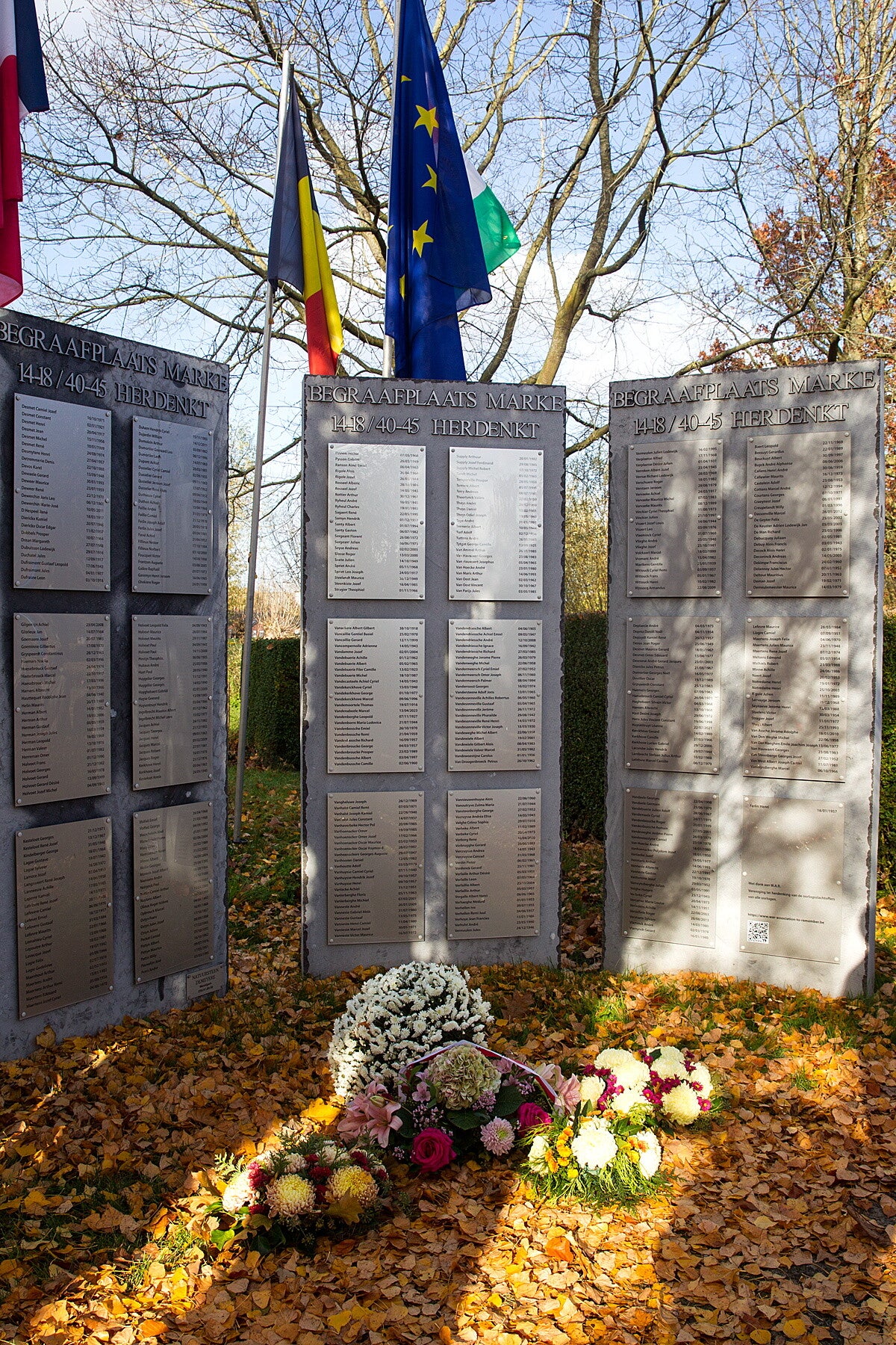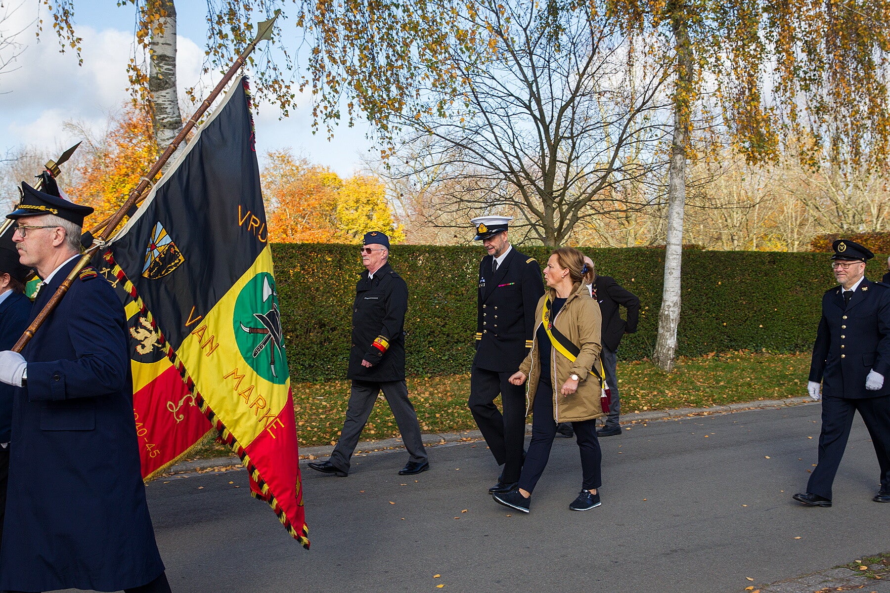 Daarop ging de stoet voorafgegaan door Harmonie Kunst en Eendracht uit Lendelede naar het memoriaal op de begraafplaats Marke. Daar werd hulde gebracht aan alle slachtoffers van de oorlogen die er hun laatste rustplaats hebben.