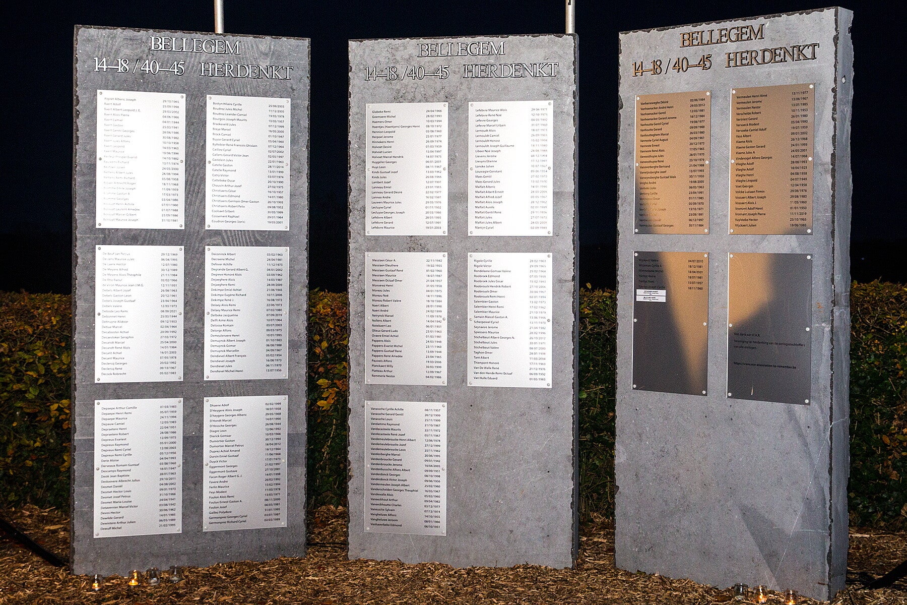 Voorafgegaan door de Koninklijke Harmonie Sint-Cecilia trok men in stoet naar de begraafplaats Bellegem voor de inhuldiging van het Memoriaal. Op drie grote arduinen panelen prijken tot nu 318 namen van oud-strijders, weerstanders, weggevoerden en opgeëisten … die op de begraafplaats hun laatste rustplaats hebben. Door een langdurige sluiting van het Rijksarchief te Brussel kan het aantal namen nog stijgen.