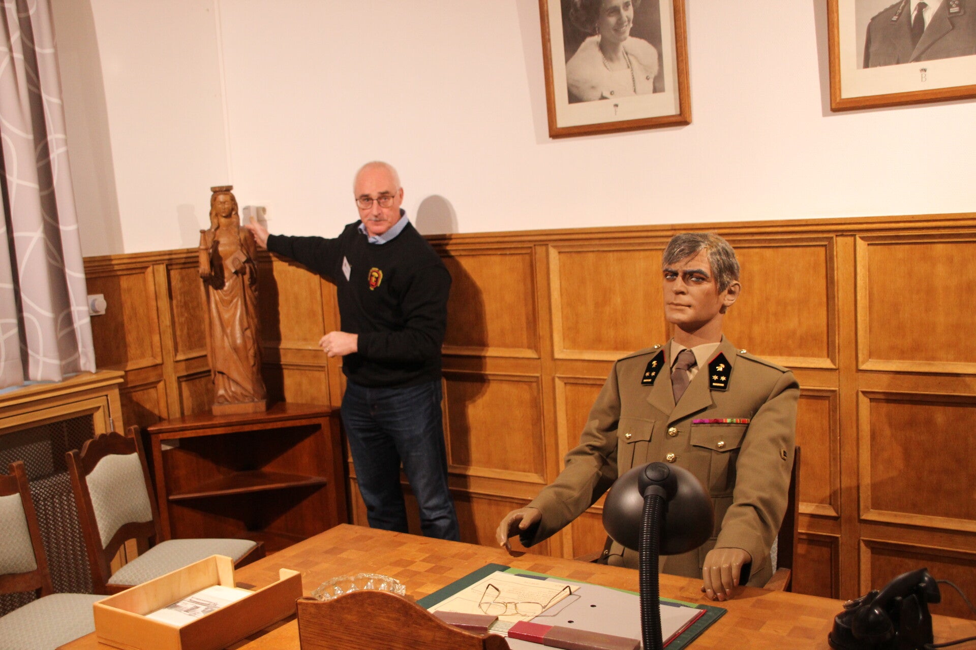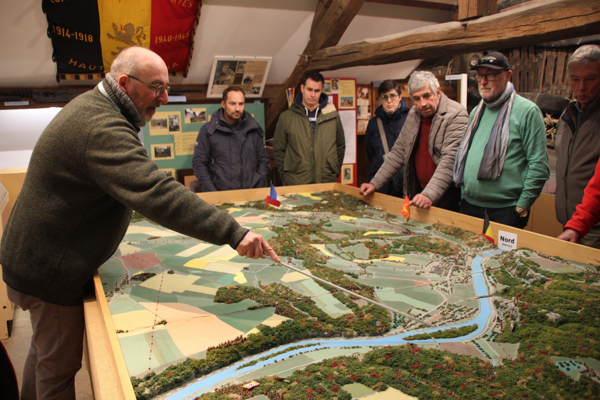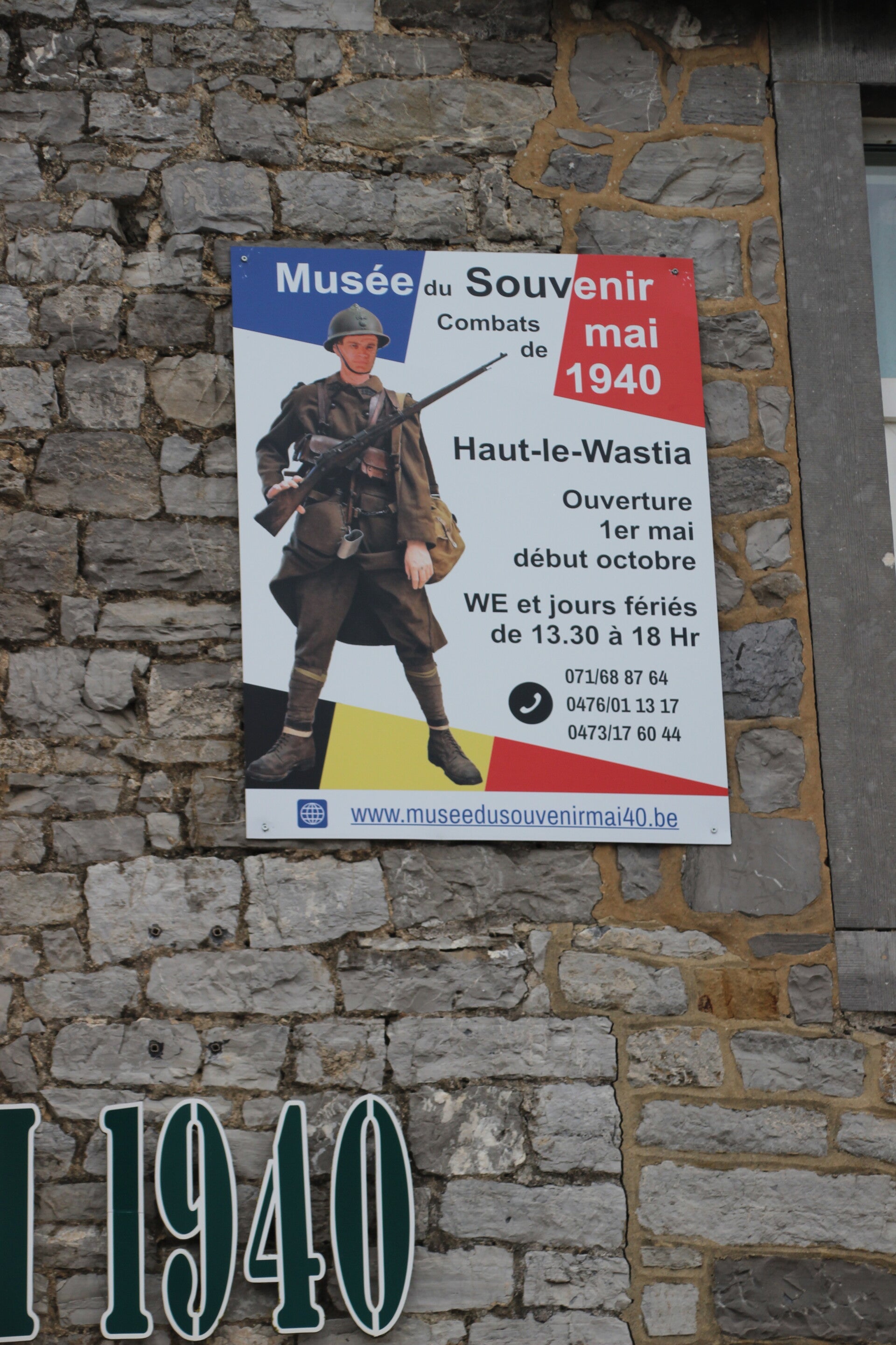 Het was nog donker toen we iets na half acht de parking aan de Hellestraat in Marke afreden. De bus reed richting Doornik om vanaf daar een heel eind de Route Wallonie te volgen. Bij de eerste halte, we waren al in Spy, werd het ontbijt verorberd, koffiekoeken met … koffie. Daarna reden linea directa (rechtstreeks) naar Haut-le-Wastia, een onooglijk klein dorpje, sedert 1965 deelgemeente van Anhée, in de provincie Namen. Daar worden wij opgewacht door Olivier Voets, majoor op rust. Hij gidst ons door het Musée du Souvenir, Mai 1940.