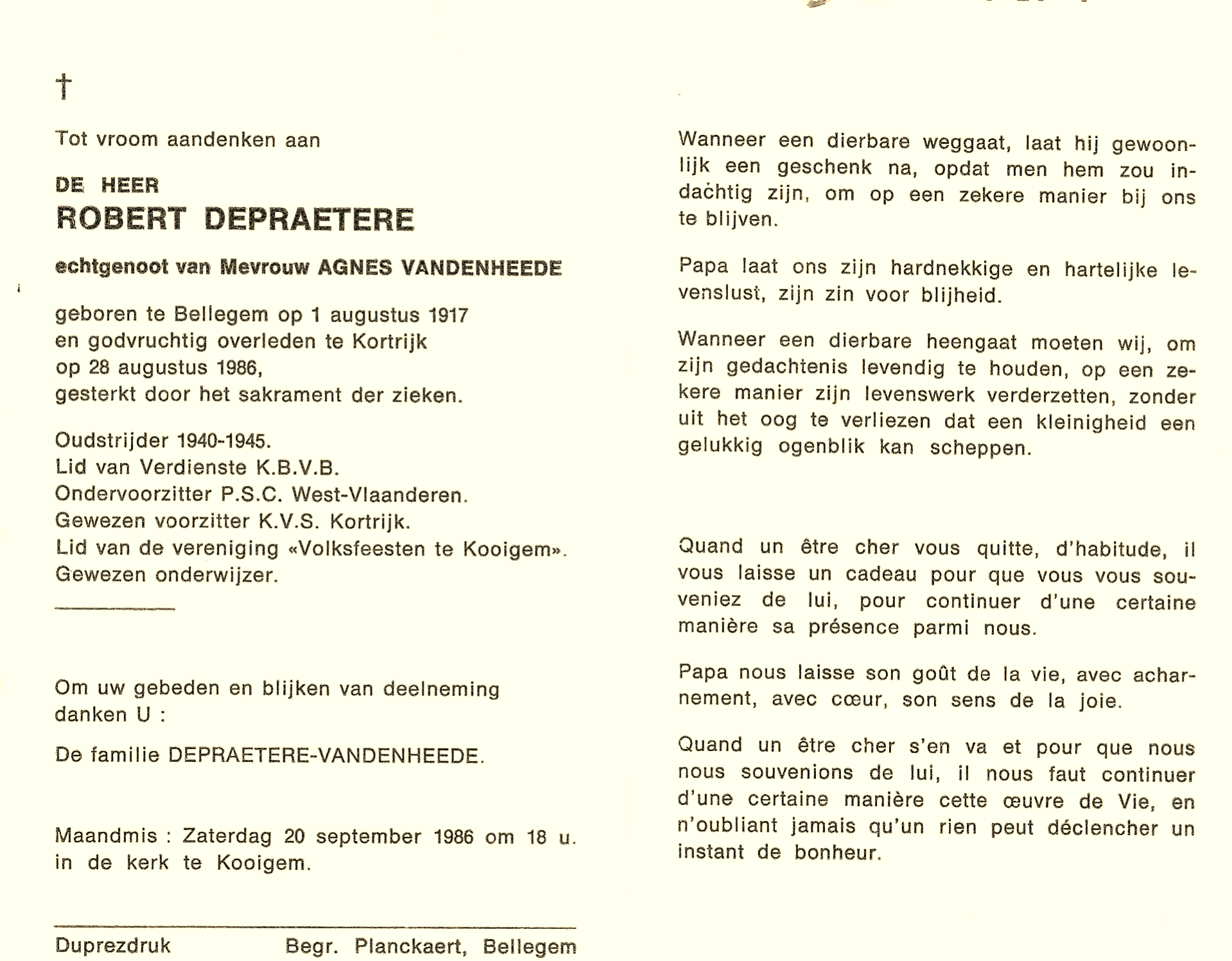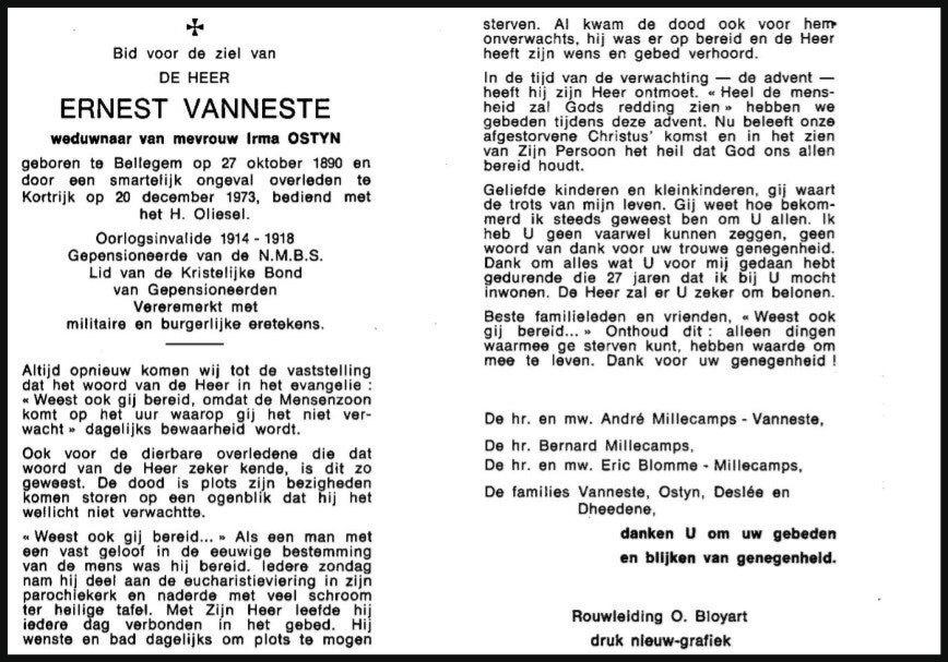 ° 22 december 1904 Bellegem + 25 september 1998 Kortrijk
