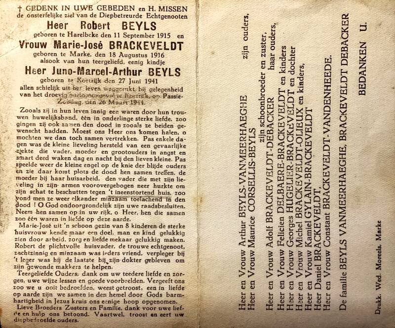 Op 26 maart 1944 werd het rangeerstation Kortrijk-Marke gebombardeerd. Alhoewel verkenningsvliegtuigen het doel markeerden kwamen veel bommen op Marke terecht o.a. op woningen op de Pottelberg. Daarbij kwam het gezin Beyls - Brackeveldt om het leven. Juno Beyls was hun enig kind. De familie is niet vermeld op het monument op Markeplaats.