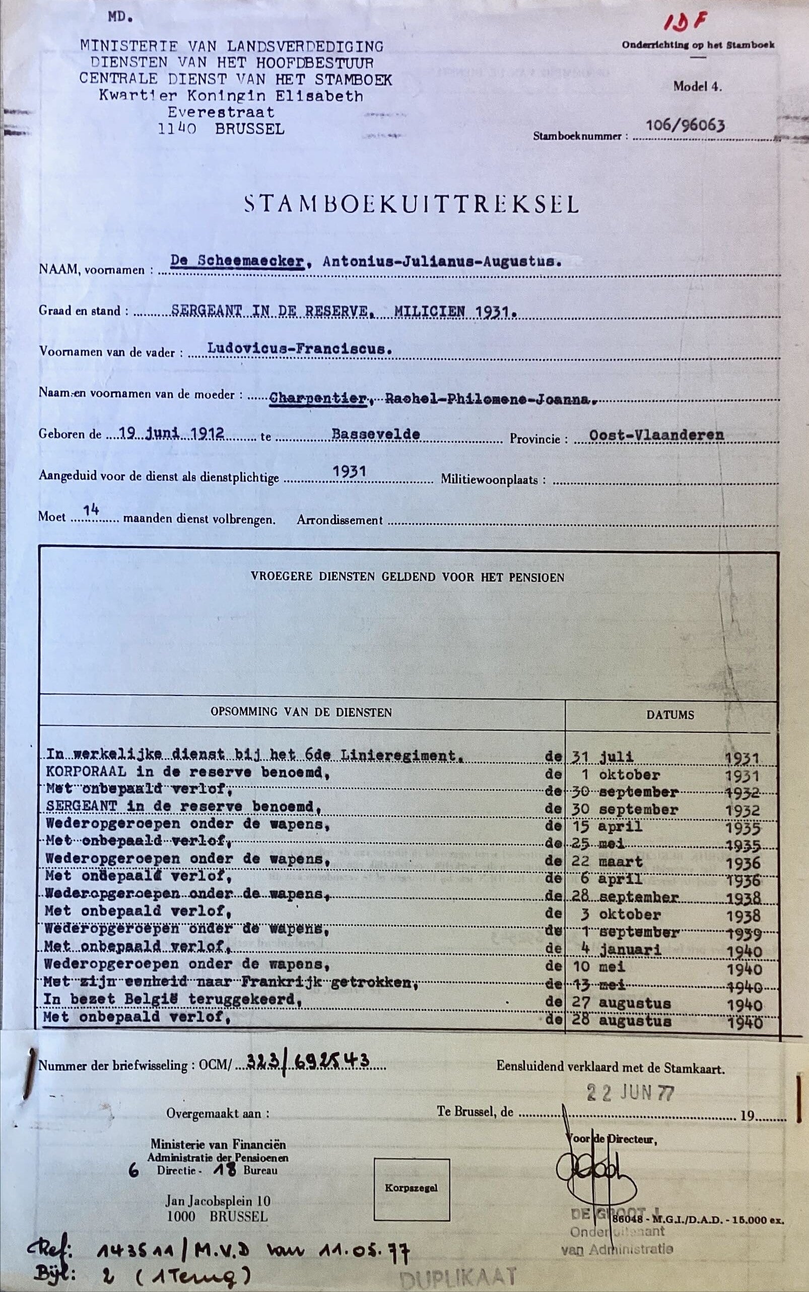 Bron: 1. Koninklijk Museum van het Leger en de Krijgsgeschiedenis - Dossier 6178857 en 2. Guldenboek Der Vuurkaart Boekdeel 35-36 pag. 6