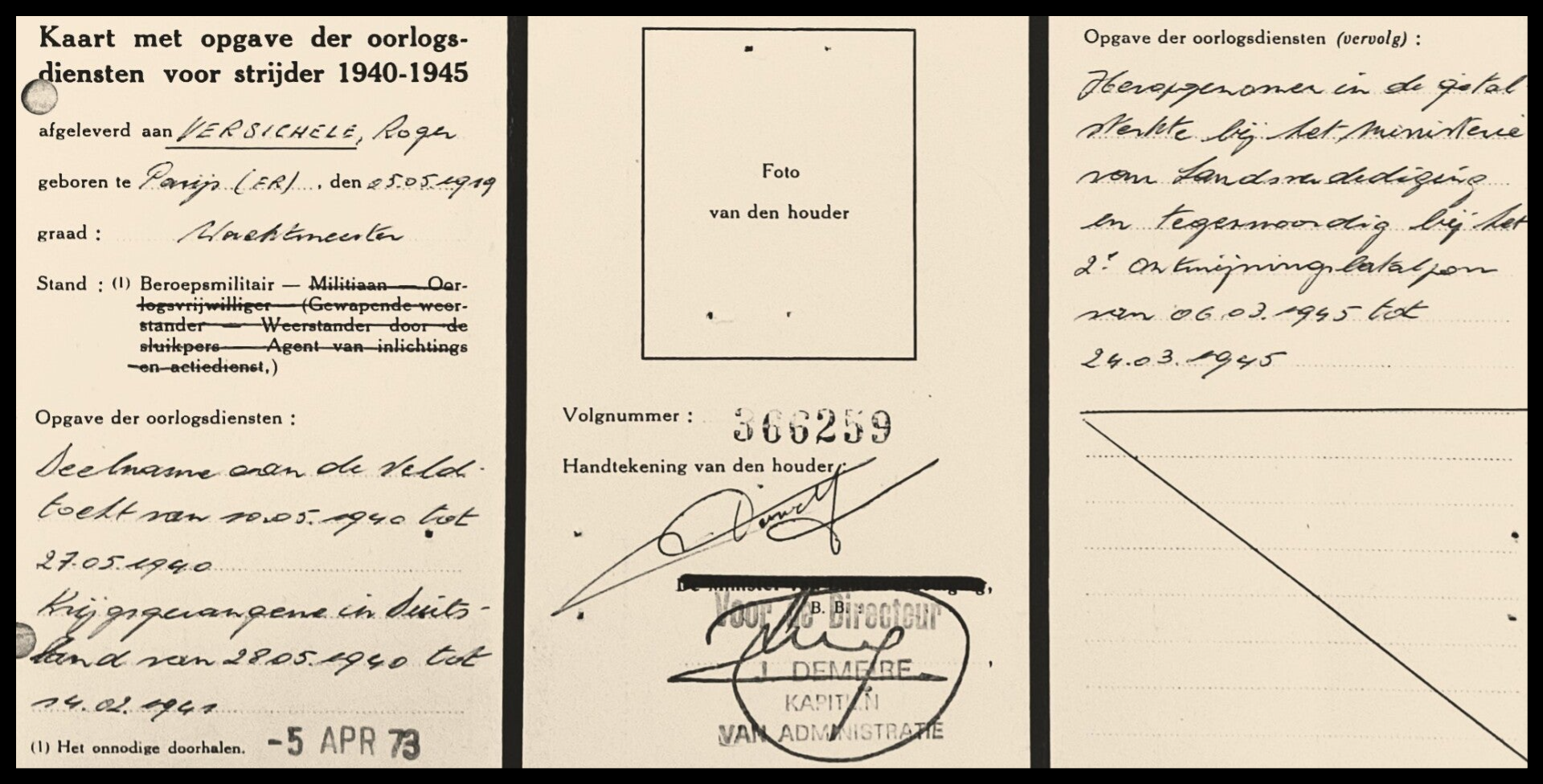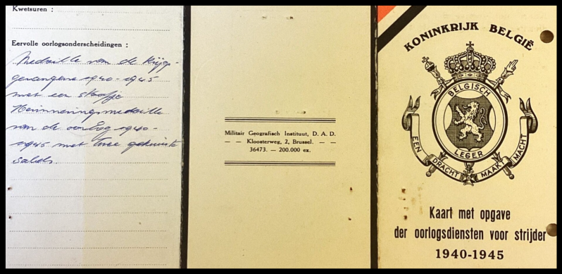 Kaart met opgave der oorlogsdiensten voor strijder 1940-1945 van Roger Versichel