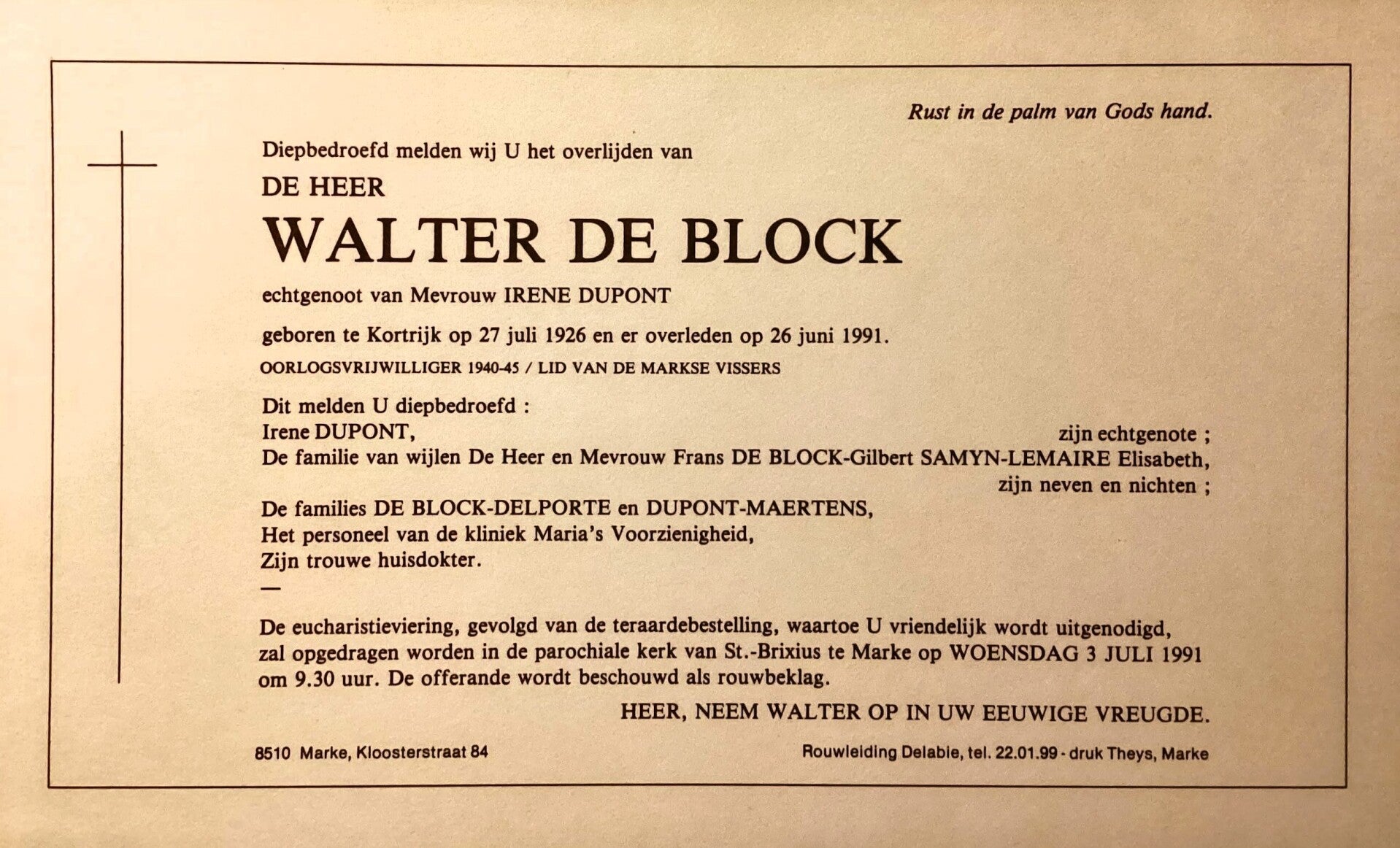 ° 29 mei 1909 Zwevegem + 21 mei 1989 Kortrijk □ Marke
