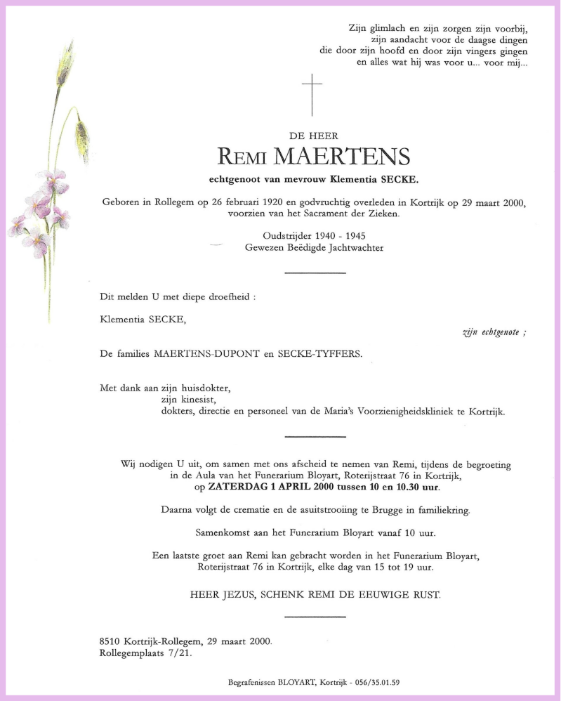 Bronnen: 1. Fiche Centra Dienst van het Stamboek - Dossier 3139312, 2. Rouwbericht, 3. Bidprentje en 4. Landelijk Leven en Hoevengids Groot Kortrijk - Deel 8 Rollegem, pag. 75